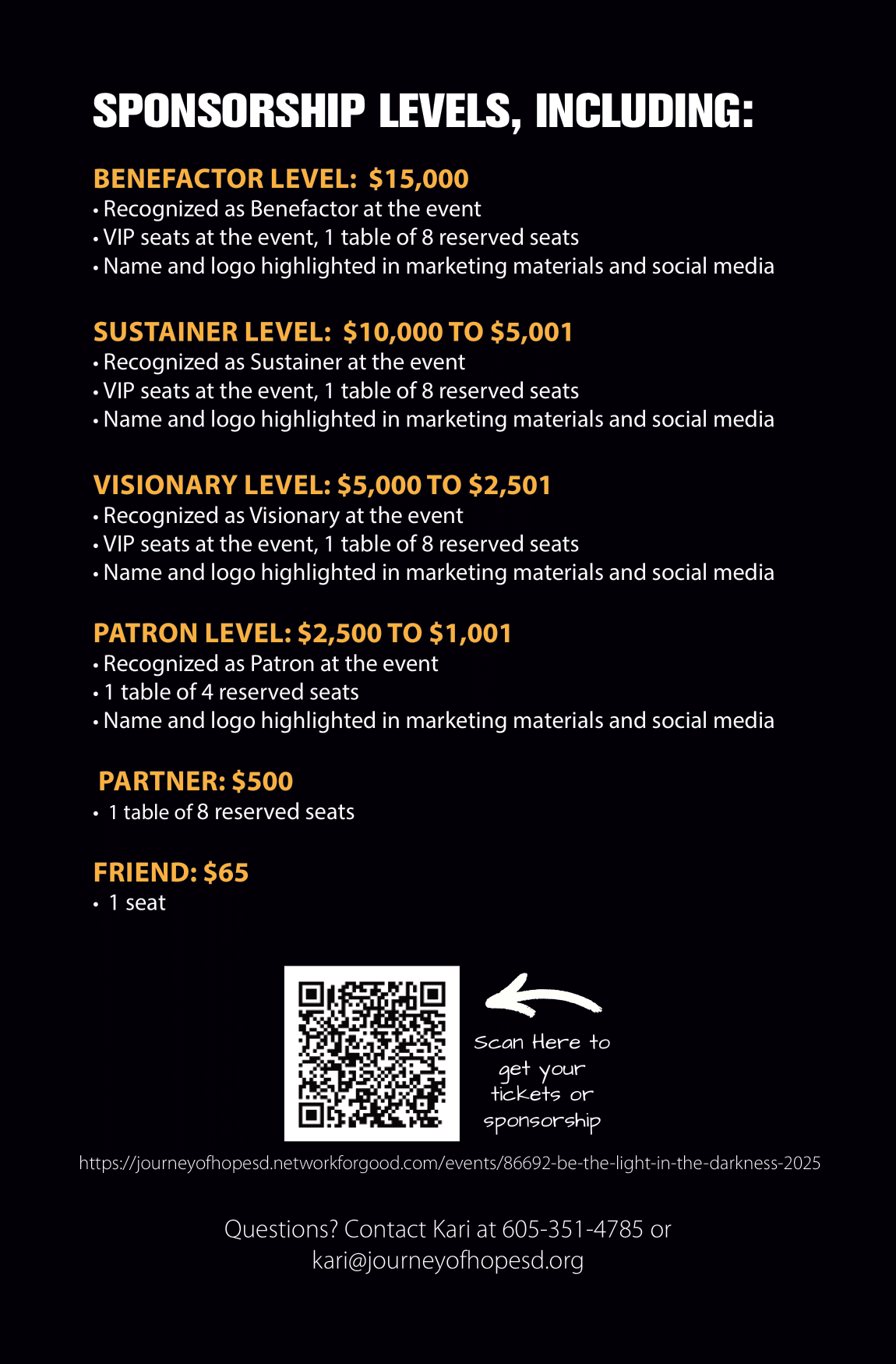 Join Journey of Hope for the 4th Annual Signature Fundraising Event: Be the Light in the Darkness. This special evening promises unforgettable moments and opportunities to support Journey of Hope. Every dollar raised will go to support the hygiene and art programs. The event begins with a social at 5:30 pm, followed by dinner at 6:00 pm. Suggested attire is business casual.